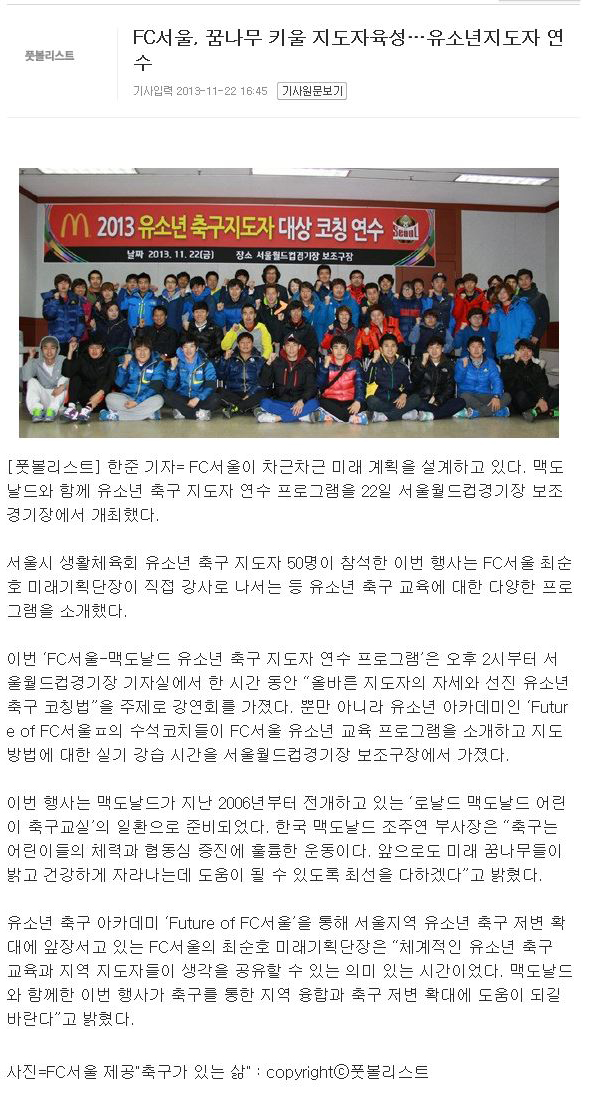 FC서울 꿈나무 키울 지도자 육성, 유소년 지도자 연수