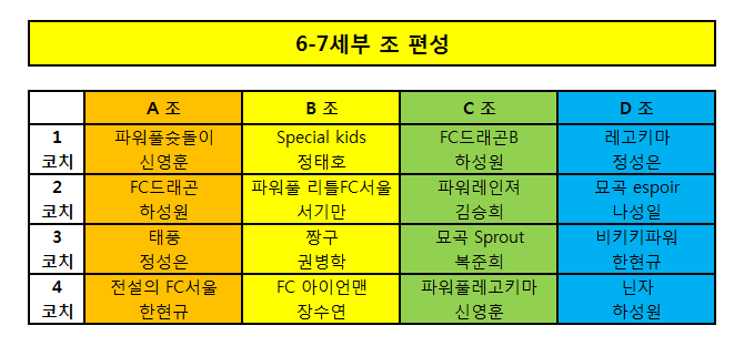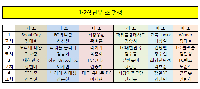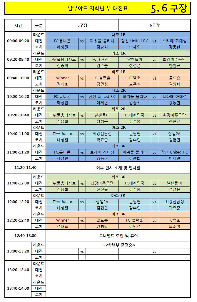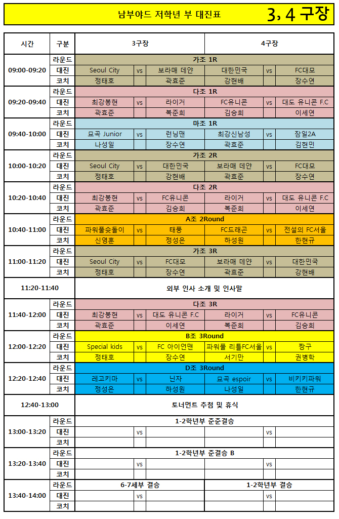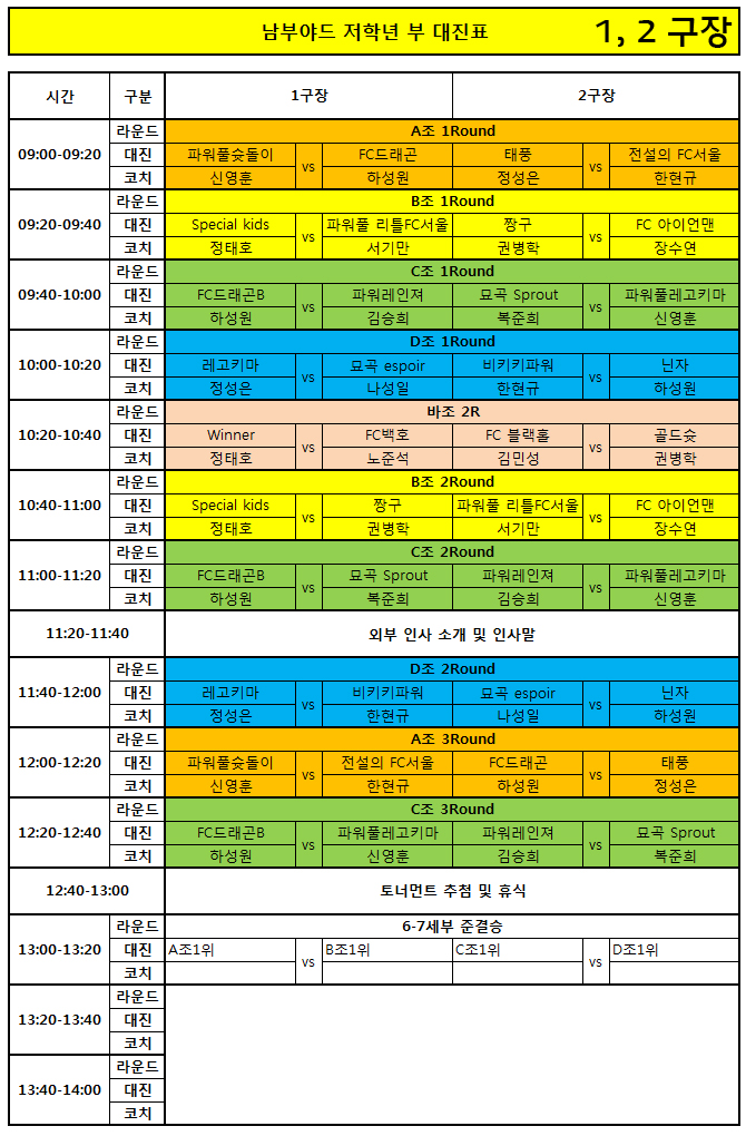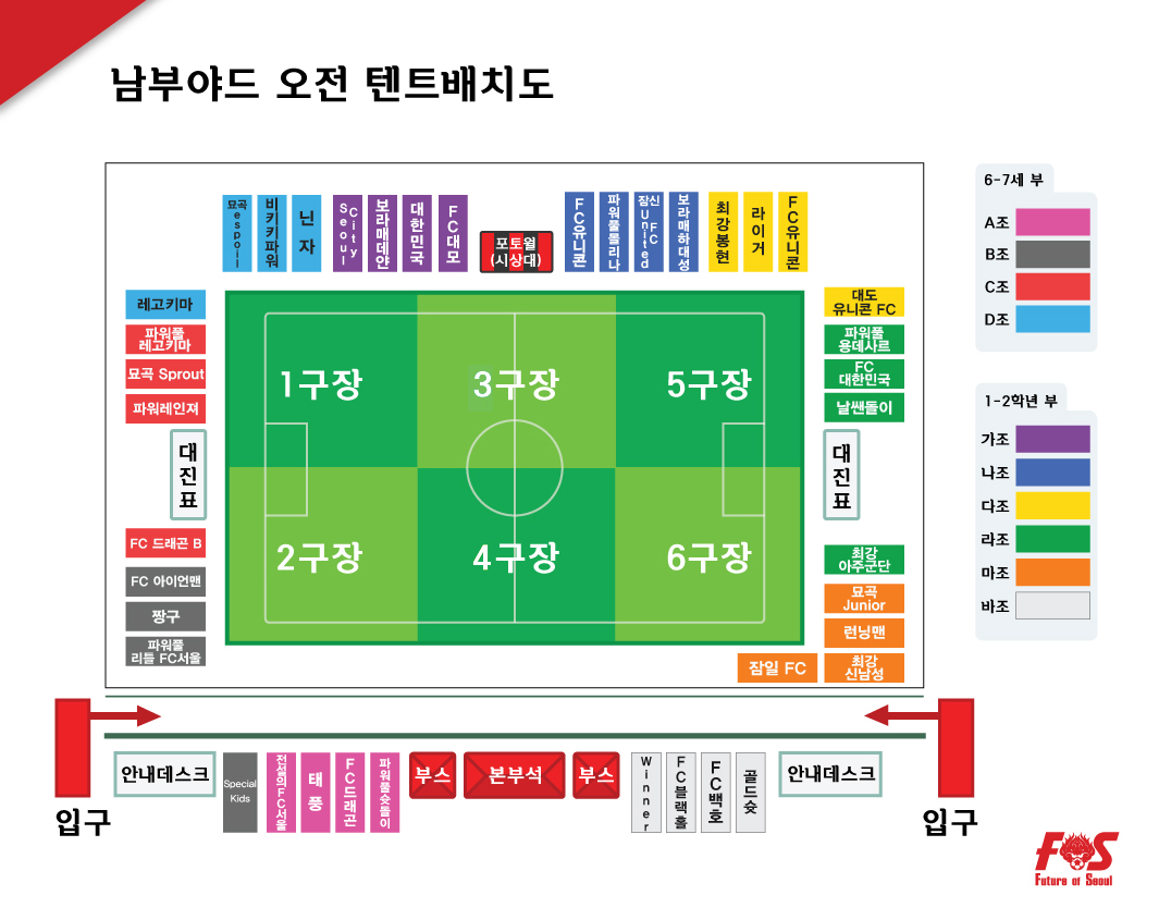※ 남부야드 컵대회 저학년 부 조편성과 대진표, 그리고 텐트 배치도 안내입니다. 사전에 꼭 확인하시길 부탁드립니다.