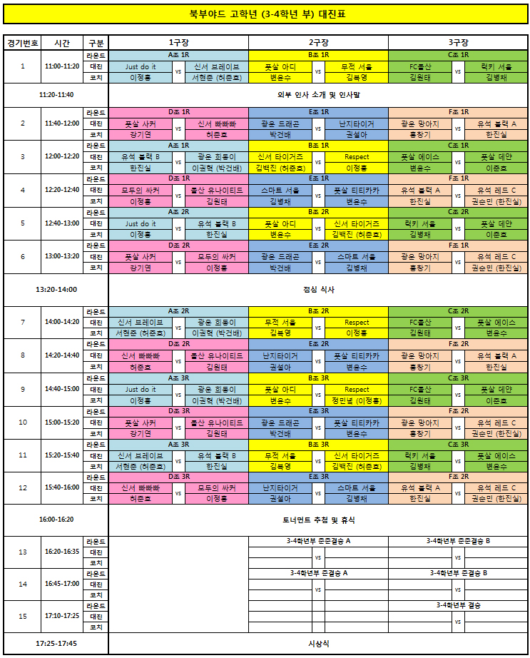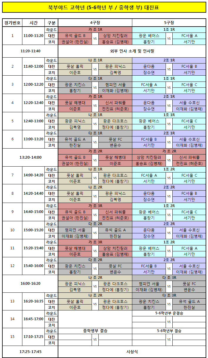 - 북부야드 컵대회 고학년부 (26일 / 토) 대회 일정 및 대진/조편성/팀 리스트 안내 -