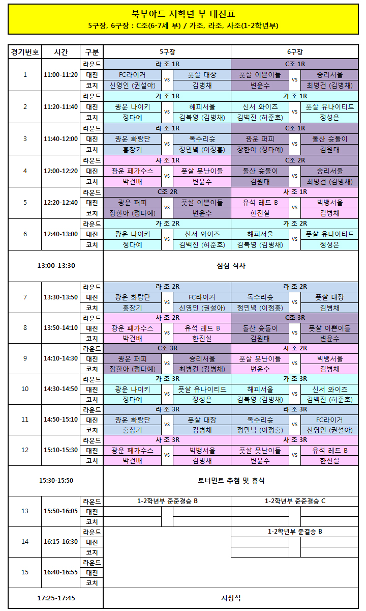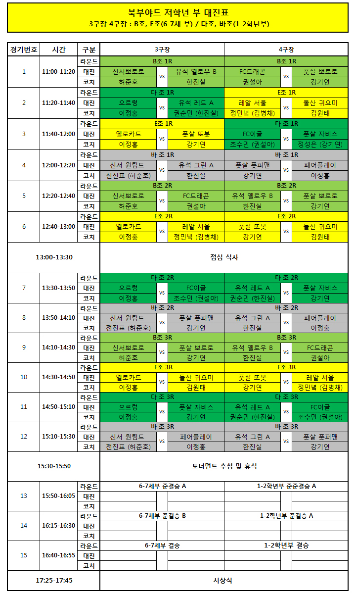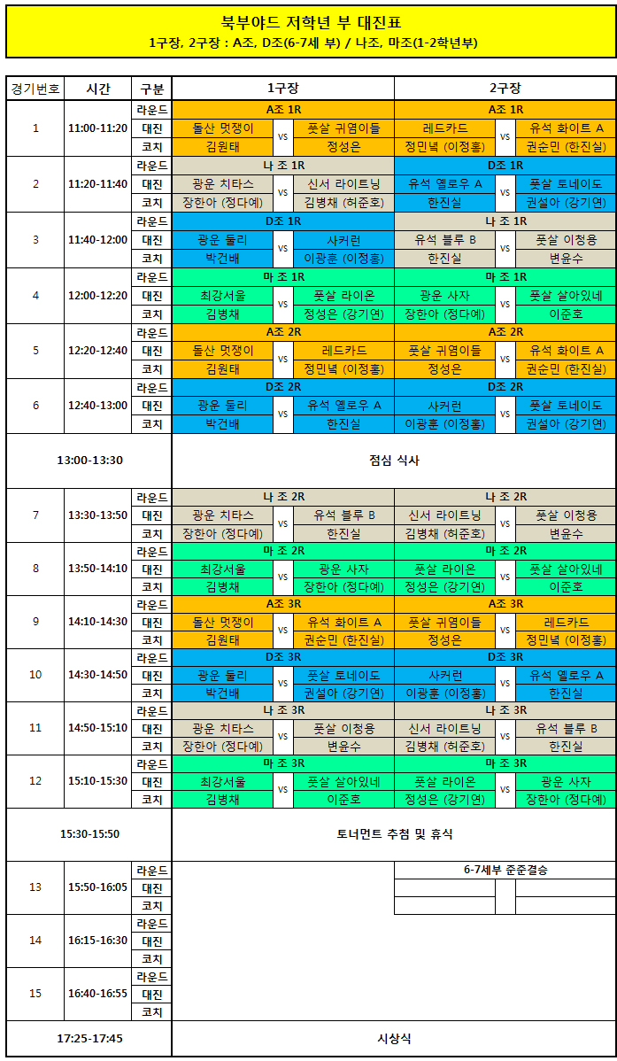 - 북부야드 컵대회 저학년부 (27일 / 일) 대회 일정 및 대진/조편성/팀 리스트 안내 -