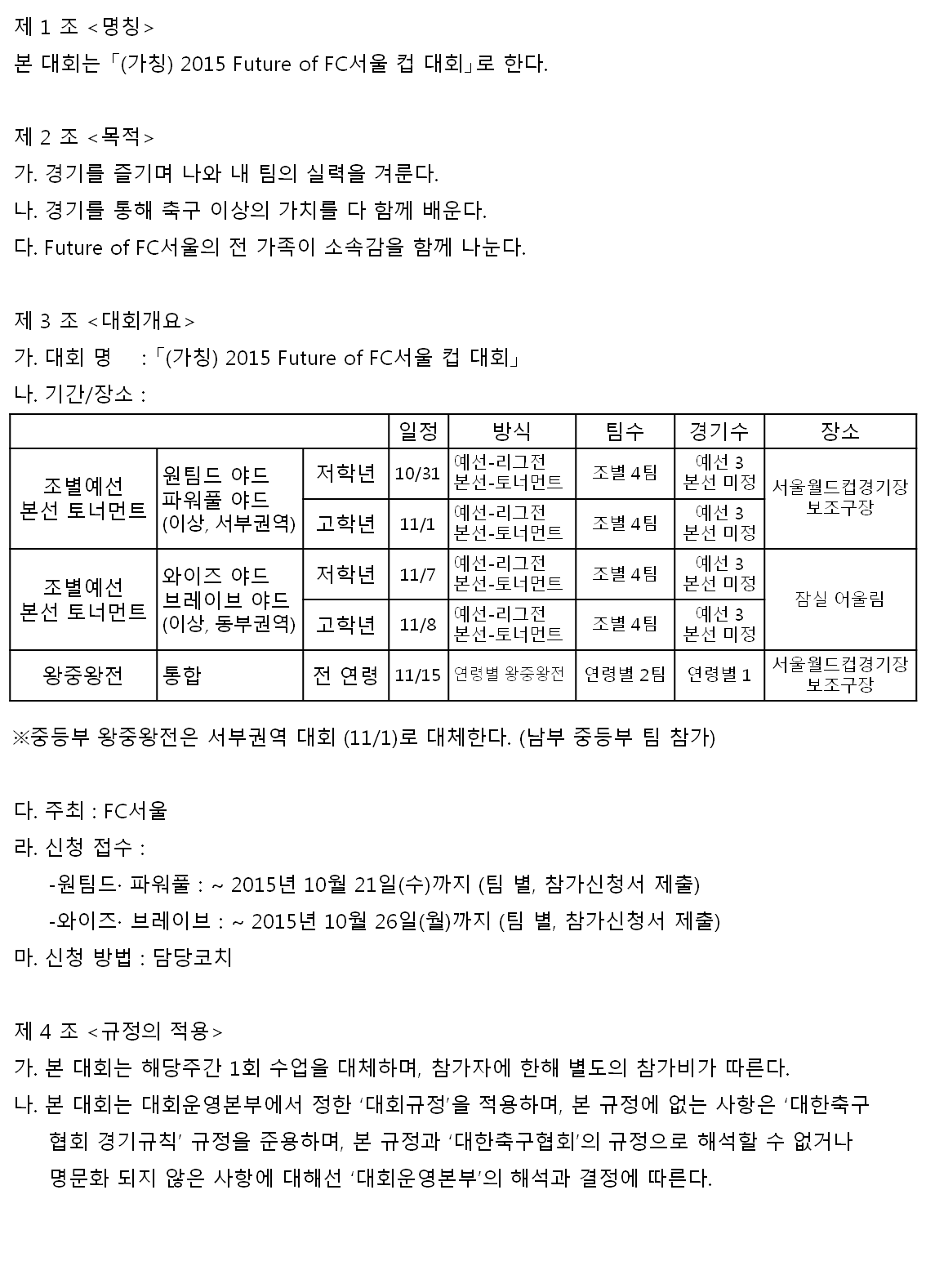 많은 참여를 통해, 2015 Future of FC서울 컵대회가 좀더 풍성해졌으면 하는 바람입니다.