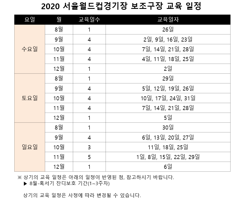 -보조구장은 천연잔디 관리 및 공공행사 대관 등에 의해 교육 일정이 변경될 수 있습니다.