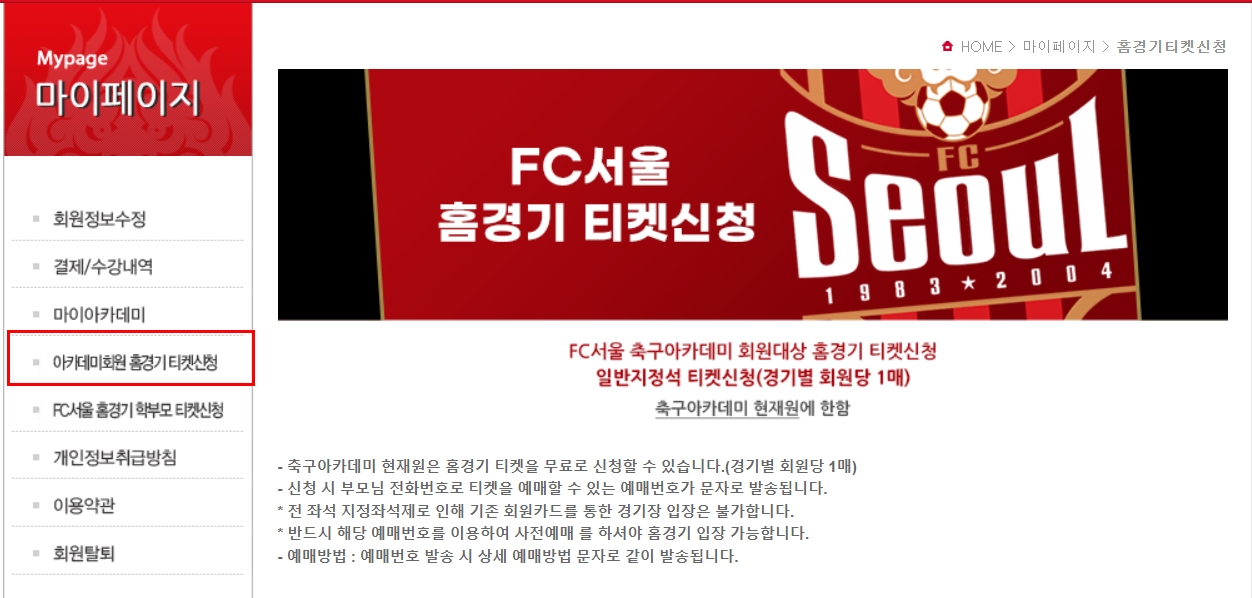 1) 아카데미회원 홈경기 티켓신청