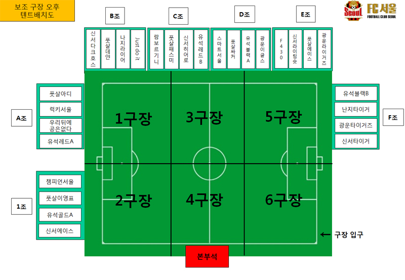 아래는 당일 보조구장 및 풋살구장의 팀별 텐트 위치도 입니다. 참고 부탁드려요^^