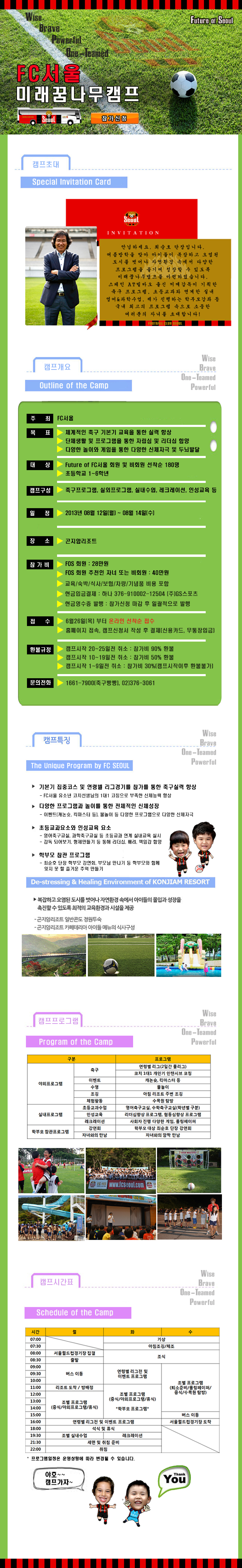 [학부모 프로그램 관련 추가 안내] 안녕하세요. 학부모 프로그램 관련 궁금해하시는 학부모님들이 많아 추가 공지 드립니다^^ 이번 캠프는 함께 참가하고 싶은 부모님이 당일 일정으로 참가하여 함께하실 수 있도록 서울에서 30~40분 거리의 곤지암 리조트에서 진행됩니다. 학부모 프로그램은 캠프 2일차 정해진 시간에 진행되며 최순호 단장 강연회, 아이와의 깜짝 만남 등의 프로그램으로 진행될 예정입니다. 이에 캠프에 참가하고싶은 부모님 누구나 리조트에 들러 준비된 프로그램에 참가하시고 아이들 만나고 돌아가실 수 있습니다. 학부모님께 별도의 숙박이나 식사가 제공되지 않으니 이점 참고하시길 바랍니다^^ 학부모프로그램에 대해선추후 보다 자세히 안내해드리겠습니다. 감사합니다!
