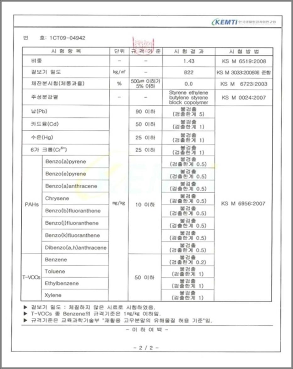 아래 사진은 FOS팀에서 사용하는 친환경 인조잔디의 유해성 TEST 결과 입니다.