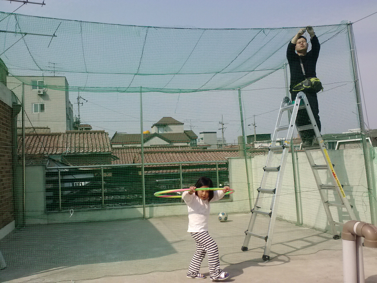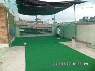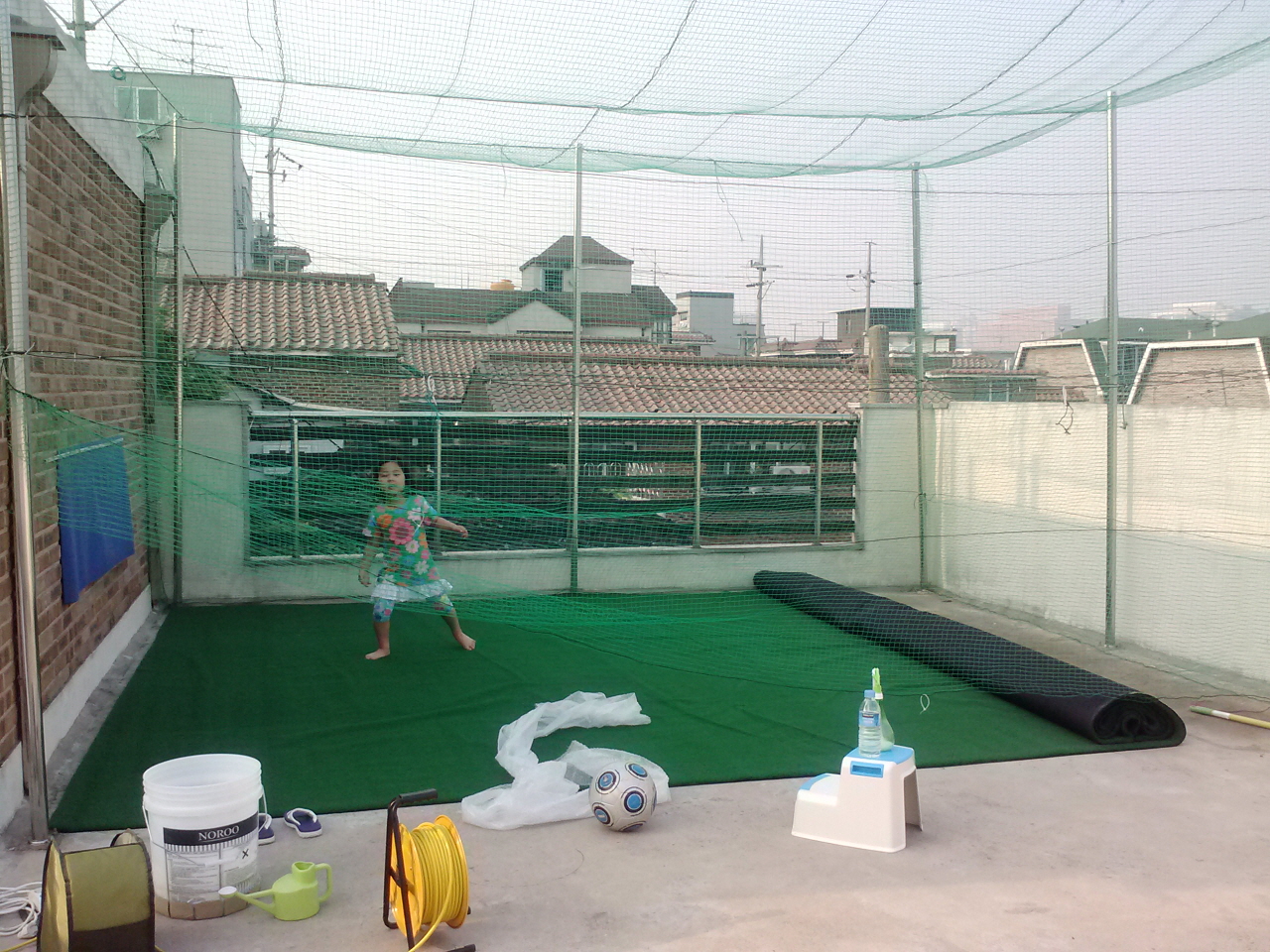 공 날라가지 않게 사방 매쉬망 설치 완료....바닥에 인조잔디 설치 중