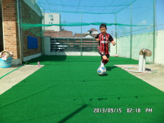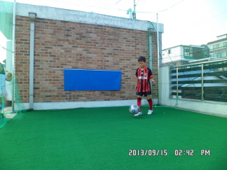 사진에 축구화가 잘 안보이는데 승준이 발목 보호를 위해서라도 고무칩이 없으니 옥상 잔디 위에서는