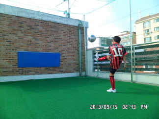 한쪽벽에 슈팅 타켓으로 매트 하나 설치 왼료..... 모든 작업 완료 옥상에 간이 축구 연습장 건설 완료....